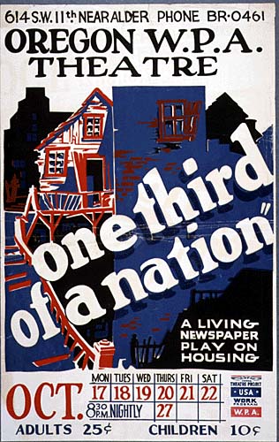 Contemporary reviews credited playwright Arthur Arent as ‘managing editor’ and cited 26 researchers who drew the incidents from 20,000 pages of relevant material. Over 80 actors were employed, making …one third of a nation… undoubtedly the most elaborate bit of stagecraft ever deployed in the name of lefty American agitprop. The chief purpose of the production was, after all, keeping theater workers gainfully employed with maximum bang for federal buck.
