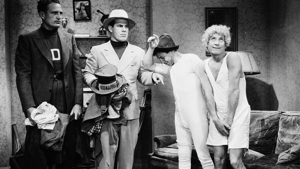 Huxley College’s new president is Quincy Adams Wagstaff (Groucho), and his idea of DEI is hiring middle-aged goofballs Baravelli (Chico) and Pinky (Harpo) as ringers to help Huxley’s football team win the big game. An urtext demonstrating how a handful of intuitively linked chaos agents can rearrange reality through wordplay and sheer disrespect, Horse Feathers showcases the Marx Brothers’ unerring instinct for upending institutional gravitas, and has influenced similarly anarchic comedies from Caddyshack to How High. Somehow, this slim film is also roomy enough to contain both the gleefully nihilist anthem “Whatever It Is, I’m Against It” and the genuinely tender trifle “Everyone Says I Love You.” (GW)